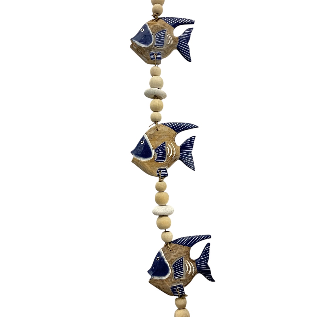 Guirlande met drie blauwe Nemo-visjes, gecombineerd met naturel houten kralen en touw. De blauwe kleur geeft een fris en speels accent dat perfect past binnen een beach, nautisch of coastal interieur. Mooi voor aan een wandhaak, deur, veranda of onder een overkapping als decoratief zomers accent.