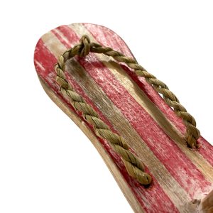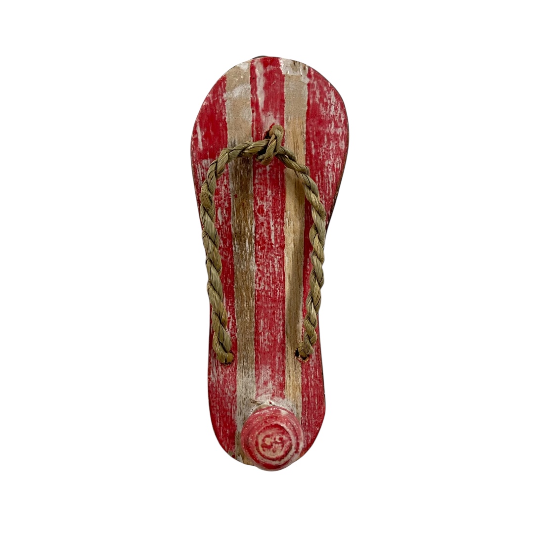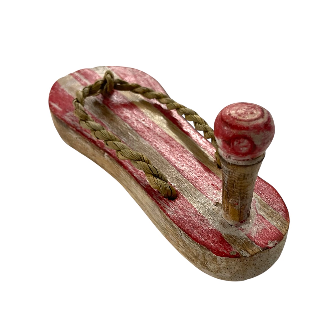 Decoratief haakje in de vorm van een slipper in donkerroze/rode tinten, gemaakt van hout met handgeschilderde details. Het vrolijke ontwerp past perfect in een beach, coastal of zomers interieur. Ideaal voor sleutels, kleine accessoires, handdoekjes of gewoon als speels wandaccent in hal, toilet of badkamer.