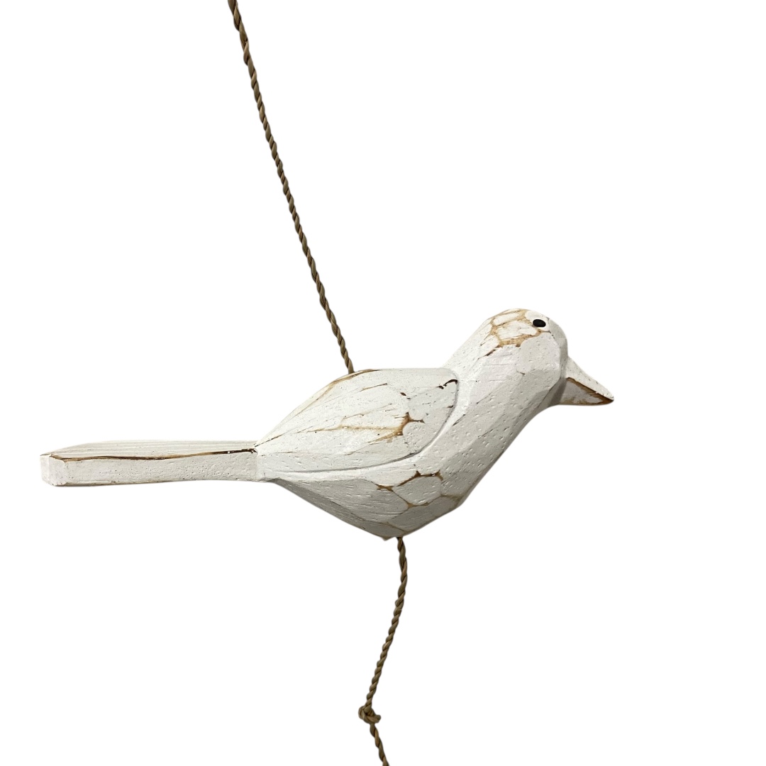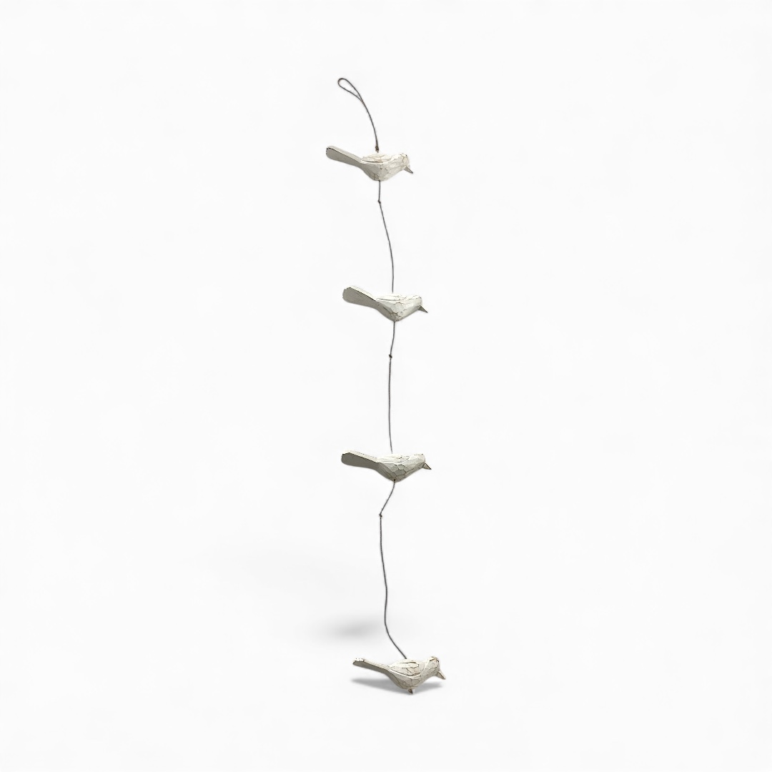 Decoratieve hanger met vier witte vogeltjes, verbonden door naturel touw. De neutrale kleur en het speelse ontwerp passen mooi binnen een beach, boho of landelijk interieur. Leuk om op te hangen aan een wandhaak, deur, kapstok of onder een overkapping.
