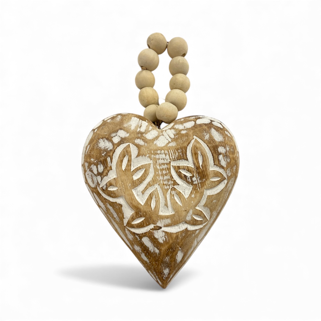 Decoratieve hanger met een groot houten hart in naturel tinten, gecombineerd met houten kralen en natuurlijk touw. De rustige, natuurlijke uitstraling maakt deze hanger perfect voor een warm en sfeervol interieur. Mooi om op te hangen aan een deur, kastknop, wandhaak of als subtiel accent aan de muur.
