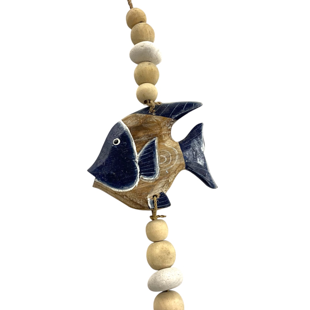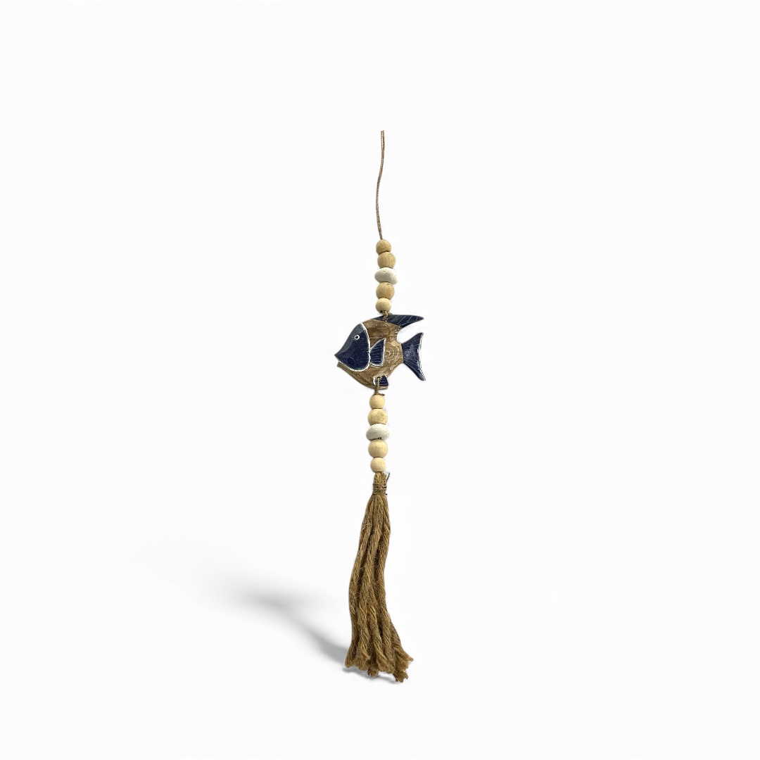 Decoratieve hanger met een blauw Nemo-visje, gecombineerd met houten kralen en naturel touw. De frisse blauwe kleur past perfect binnen een beach, coastal en nautisch interieur. Leuk om op te hangen aan een wandhaak, deur, veranda of als speels zomers accent in huis.