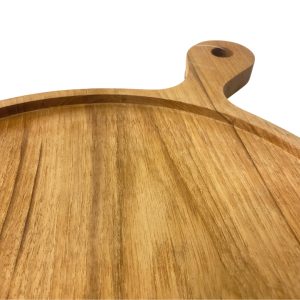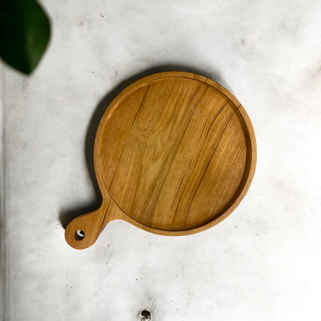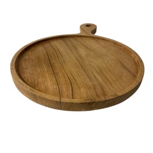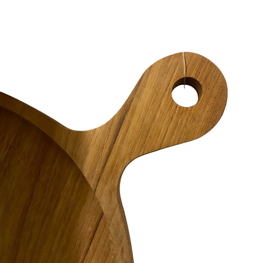 De warme houtkleur en ronde vorm geven de plank een natuurlijke, tijdloze uitstraling die perfect past binnen zowel moderne als landelijke interieurs. Het handvat zorgt niet alleen voor een speels detail, maar maakt de plank ook ideaal om op te hangen aan een haakje als decoratief element in de keuken.