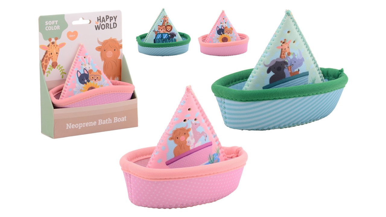 Dit vrolijke Happy World neoprene badbootje zorgt voor extra speelplezier in bad of in het zwembad. Het bootje is gemaakt van zacht neopreen en is licht van gewicht, waardoor het prettig en veilig is voor kleine handjes. Het speelse design en de zachte kleuren maken het badderen nog leuker.