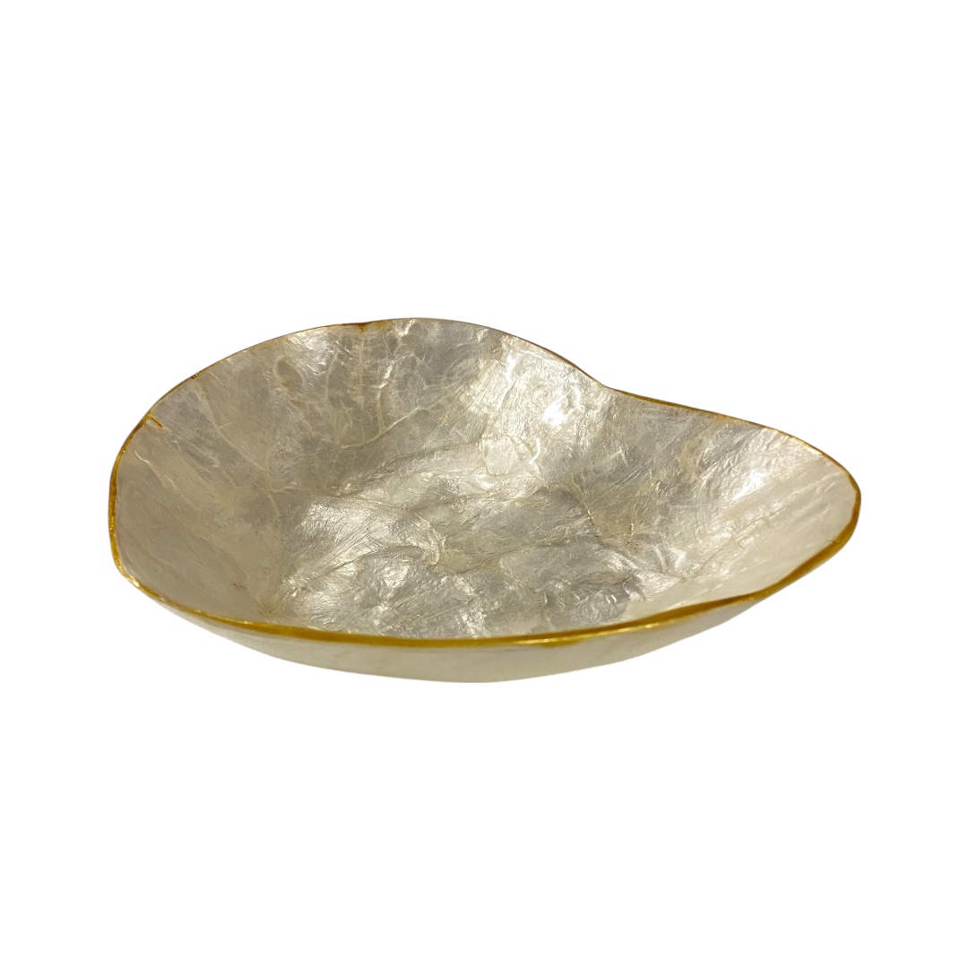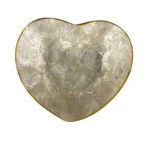 Deze hartvormige capiz schaal met gouden rand in maat L is een prachtig decoratiestuk dat luxe en warmte toevoegt aan iedere ruimte. De glanzende capiz schelp weerkaatst het licht op een mooie manier, terwijl de gouden rand een elegant detail vormt. Ideaal als sieradenschaaltje, tafeldecoratie of als eyecatcher in een open kast of dressoir.