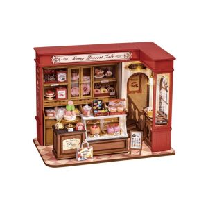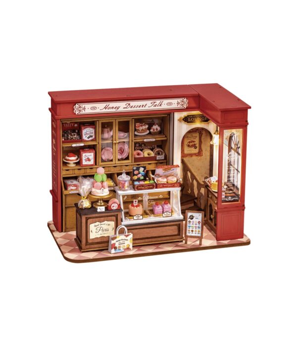 Het is tijd voor smakelijke lekkernijen van Honey Dessert Talk, een zoete en stijlvolle Franse patisserie van Rolife. Deze doe-het-zelfminiatuur is gevuld met verrukkelijke creaties die kunstig worden tentoongesteld in charmante glazen kasten en houten planken. Voeg dit schattige model vandaag nog toe aan uw miniatuurhuiscollectie!