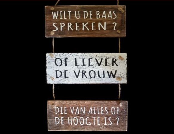 Houten borden de baas of vrouw naturel/Antique white 30x20cm, handgemaakt in Indonesië. Wilt u de baas spreken? of liever de vrouw die van alles op de hoogte is?