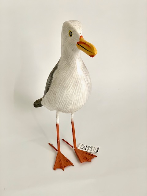 Houten staande meeuw ±40cm. Dit mooie beeld van een meeuw is gemaakt van hout, is prachtig beschilderd en heeft een formaat van ongeveer 40 cm.