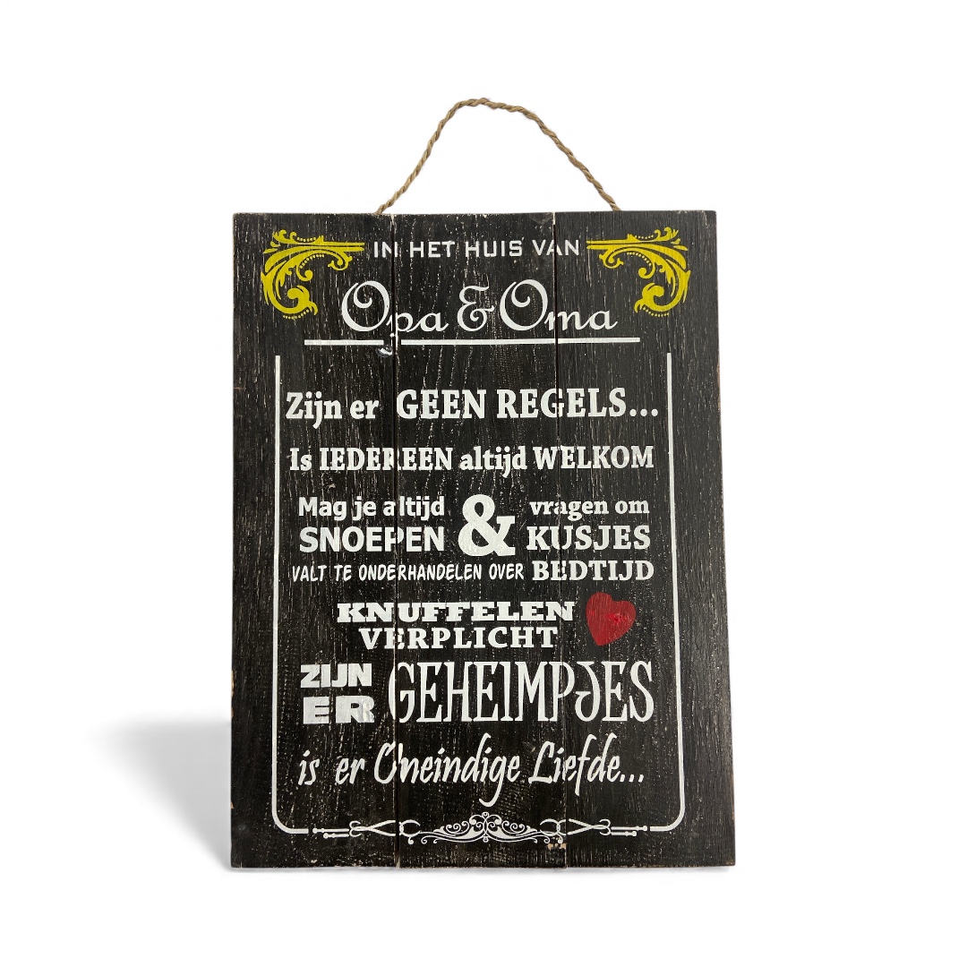 Houten tekstbord met de tekst “In het huis van opa & oma …”, uitgevoerd in een warme, tijdloze stijl. Dit decoratieve bord straalt gezelligheid en familiegevoel uit en is een mooie toevoeging aan het interieur van opa en oma. Perfect om op te hangen in de woonkamer, hal, keuken of logeerkamer als liefdevol en persoonlijk accent.