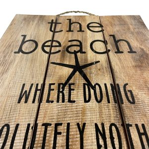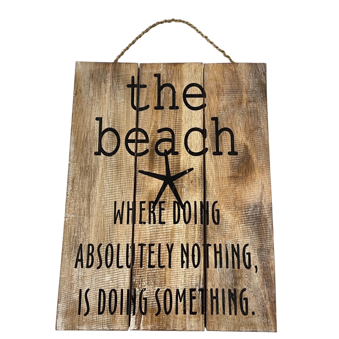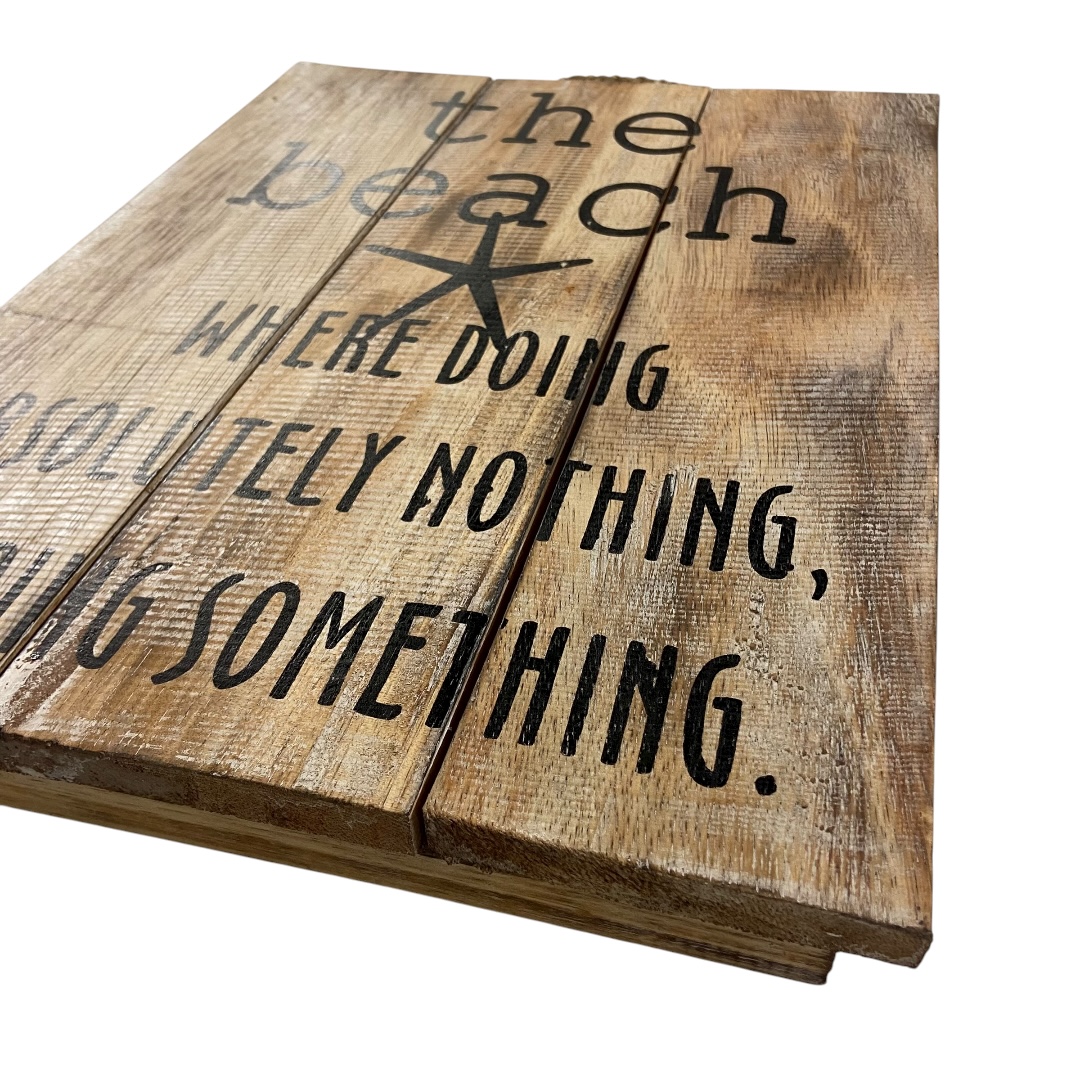 Breng de ontspannen sfeer van het strand in huis met dit handgemaakte houten tekstbord “The Beach Where Doing Absolutely Nothing is Doing Something”.