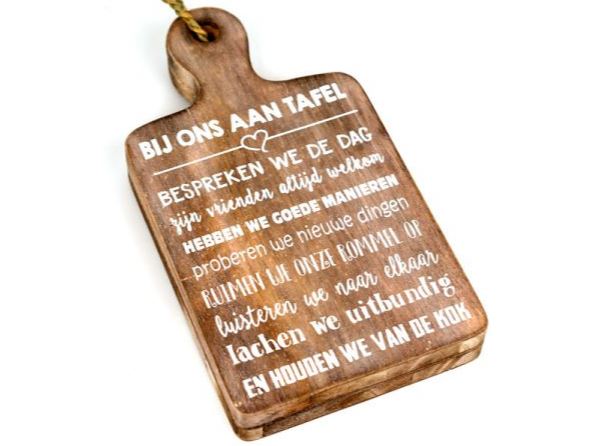 Houten tekstbord ‘Bij ons aan tafel..’
