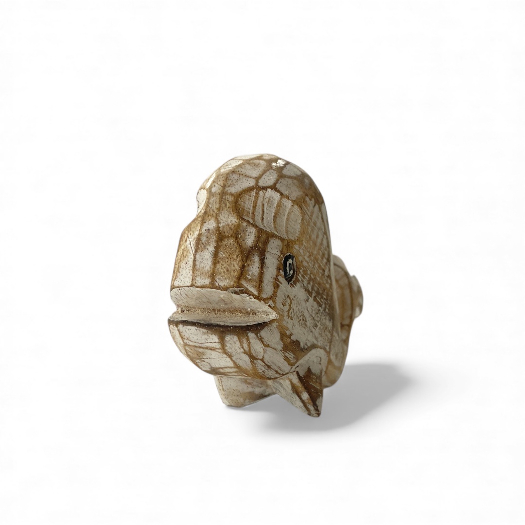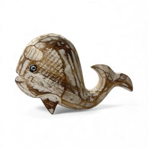 Decoratieve houten walvis Moby Dick in klein formaat (Maat S) van ca. 14,5 x 8?cm. Dit handgemaakte beeldje geeft een speels en maritiem accent aan je interieur. Ideaal voor op een plank, dressoir of vensterbank en perfect te combineren met andere nautische of beach-accessoires voor een gezellige, sfeervolle touch.