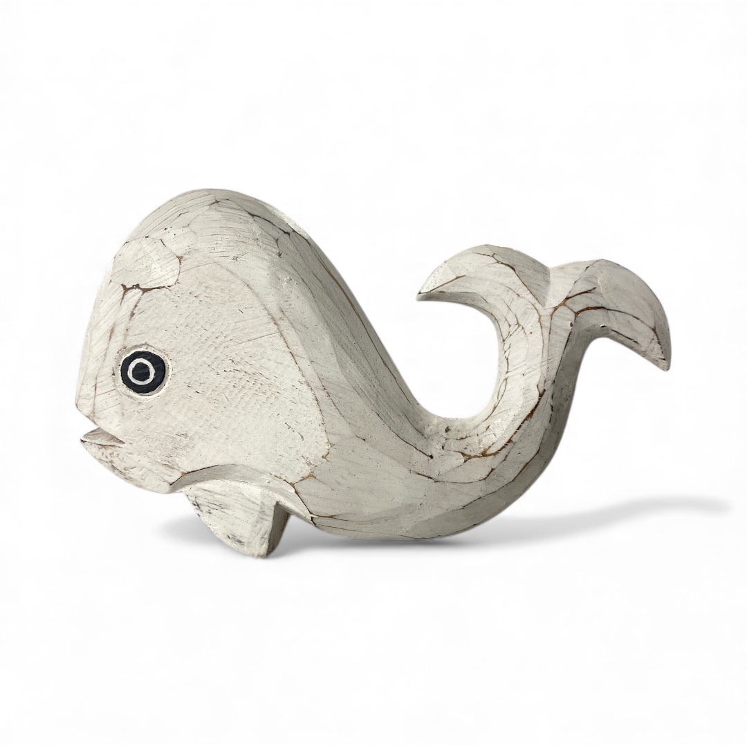 Deze houten walvis “Moby Dick” in wit/naturel is een prachtig en opvallend decoratiestuk dat elke ruimte een rustige, maritieme sfeer geeft. Door de handgemaakte details, het verweerde witte oppervlak en de elegante ronding heeft het beeld een stijlvolle, zachte uitstraling die perfect past in een beachy interieur, een lichte woonkamer, een hal of een sfeervolle veranda.