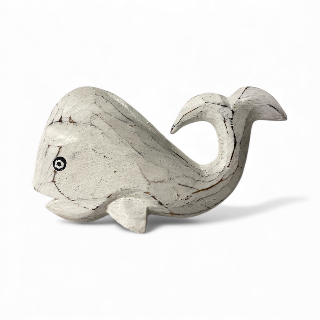 Deze middelgrote houten walvis “Moby Dick” in wit/naturel brengt een zachte, rustgevende sfeer in elke ruimte. Door het subtiele verweerde witte effect heeft het beeld een authentieke, beach house uitstraling die perfect aansluit bij maritieme en natuurlijke woonstijlen. Het formaat maakt het een ideale decoratie voor een dressoir, sfeertafel, badkamerrek of als onderdeel van een thematische interieurstyling.