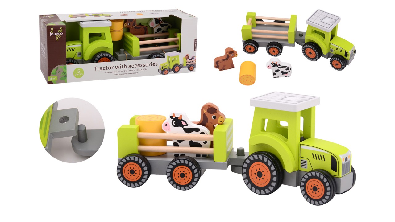 Het speelgoed is gemaakt van hout en afgewerkt in rustige, kindvriendelijke kleuren. Spelen met de tractor helpt bij de ontwikkeling van motorische vaardigheden, hand-oogcoördinatie en creativiteit. Dankzij de degelijke kwaliteit is deze set geschikt voor intensief spelen en een mooie aanvulling op elke speelgoedcollectie.