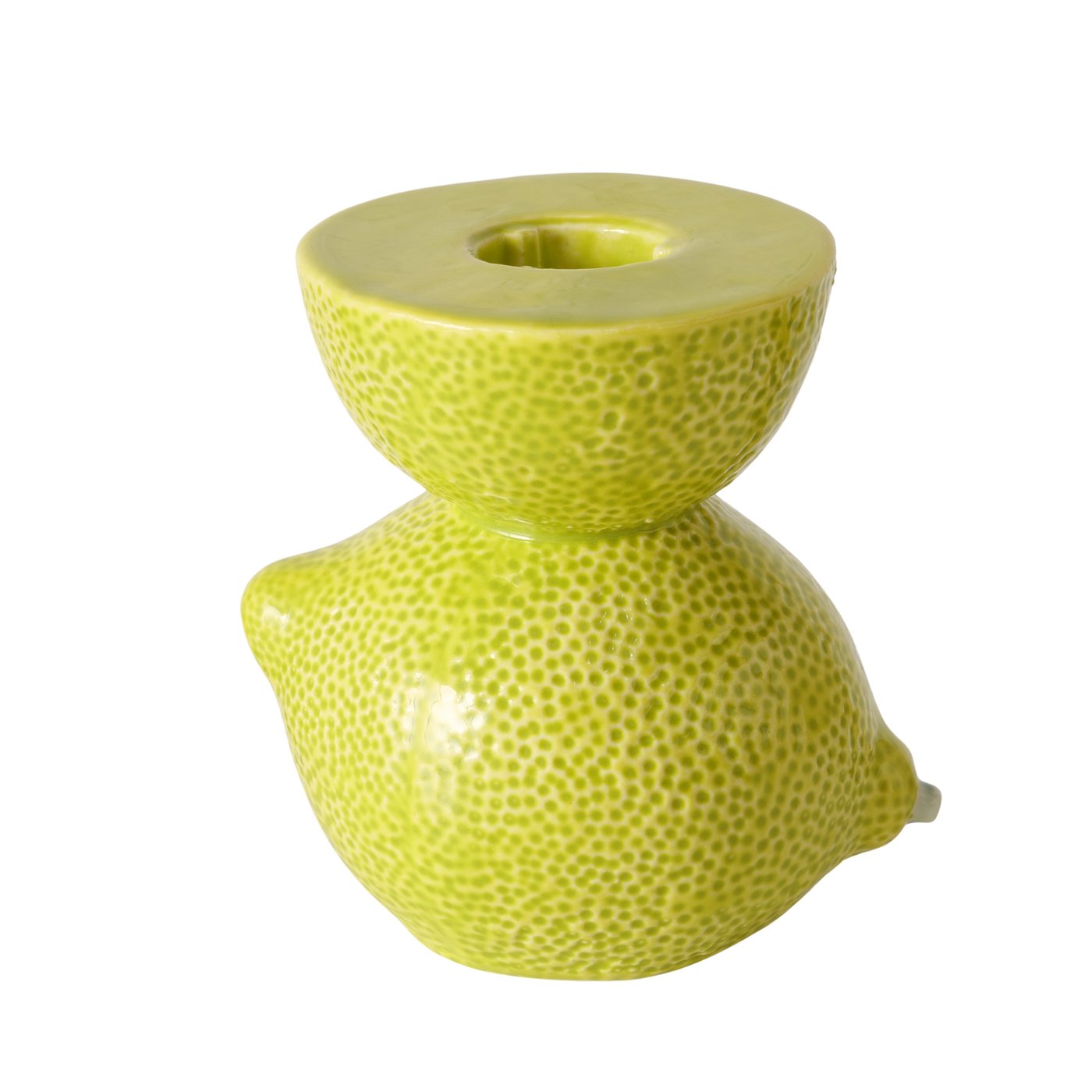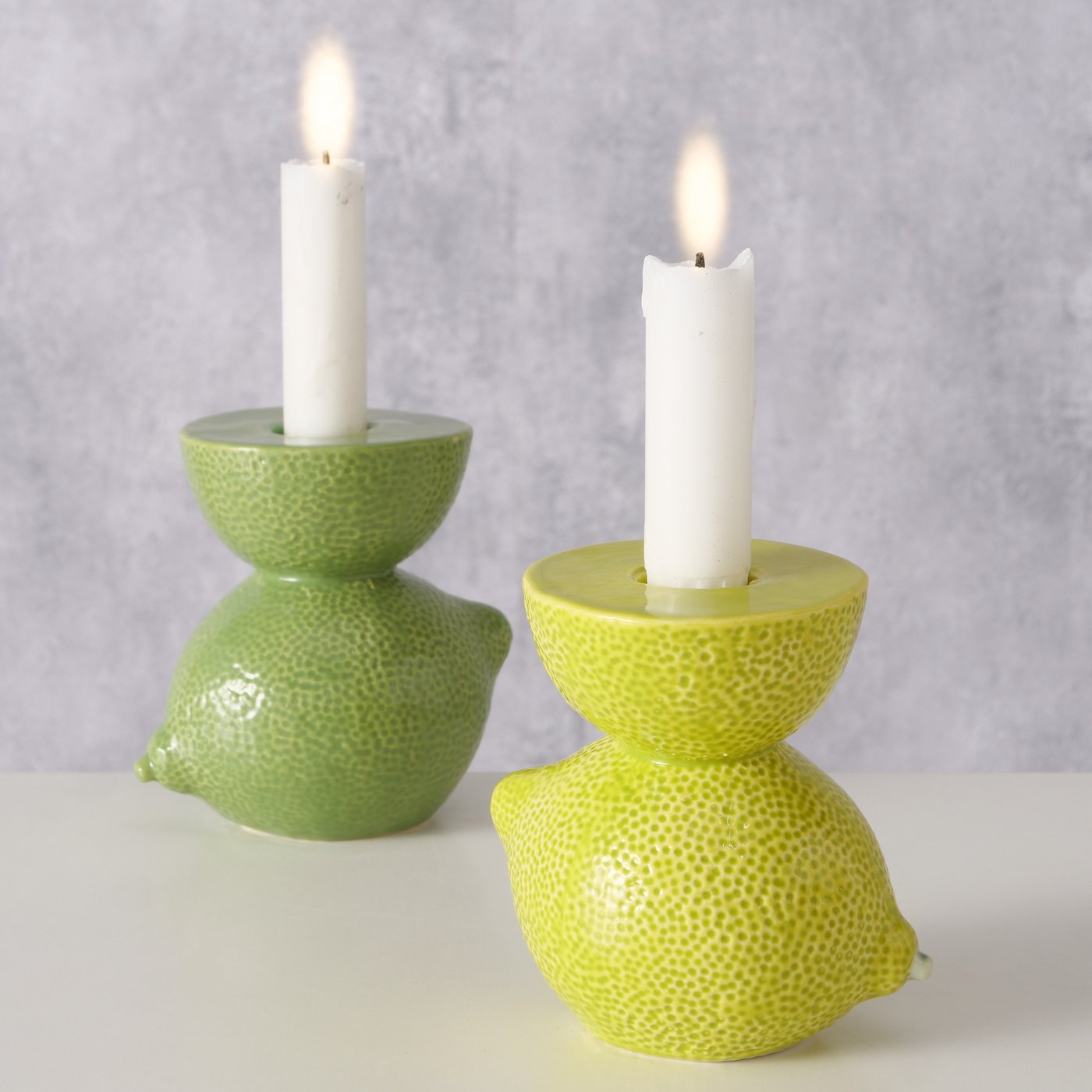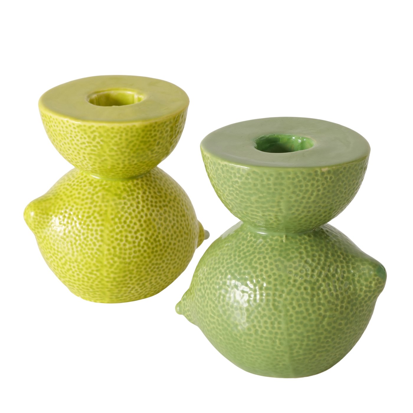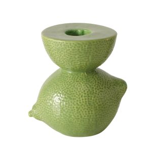 Deze vrolijke kaarshouders in lime-design brengen meteen een frisse, zomerse sfeer in huis. De speelse vorm en glanzende afwerking maken ze perfect voor op een dienblad, dressoir of in een kleurrijke tafelsetting. Leuk om te combineren met andere fruitige decoraties of keramiek in natuurlijke tinten.