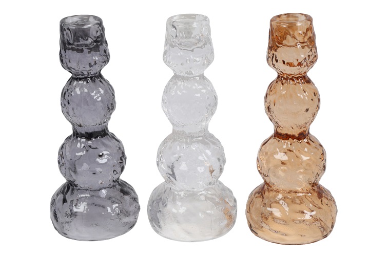 Kandelaar Skylar M is een elegante glazen kandelaar met een opvallend design van gestapelde, ronde vormen. De organische structuur in het glas zorgt voor een prachtig lichteffect wanneer de kaars brandt. Deze kandelaar wordt assorti geleverd in drie kleuren, waaronder rookgrijs, helder en warm amber, waardoor iedere variant een eigen sfeer creëert.