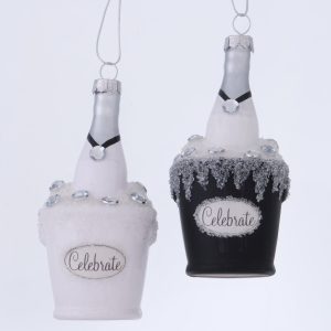 Vier de feestdagen met een vleugje glamour dankzij deze elegante kersthanger in de vorm van een champagnefles. Uitgevoerd in stijlvol zwart, wit en zilver, afgewerkt met een fonkelende diamant, is dit ornament een echte eyecatcher voor een chique kerstboom vol klasse.