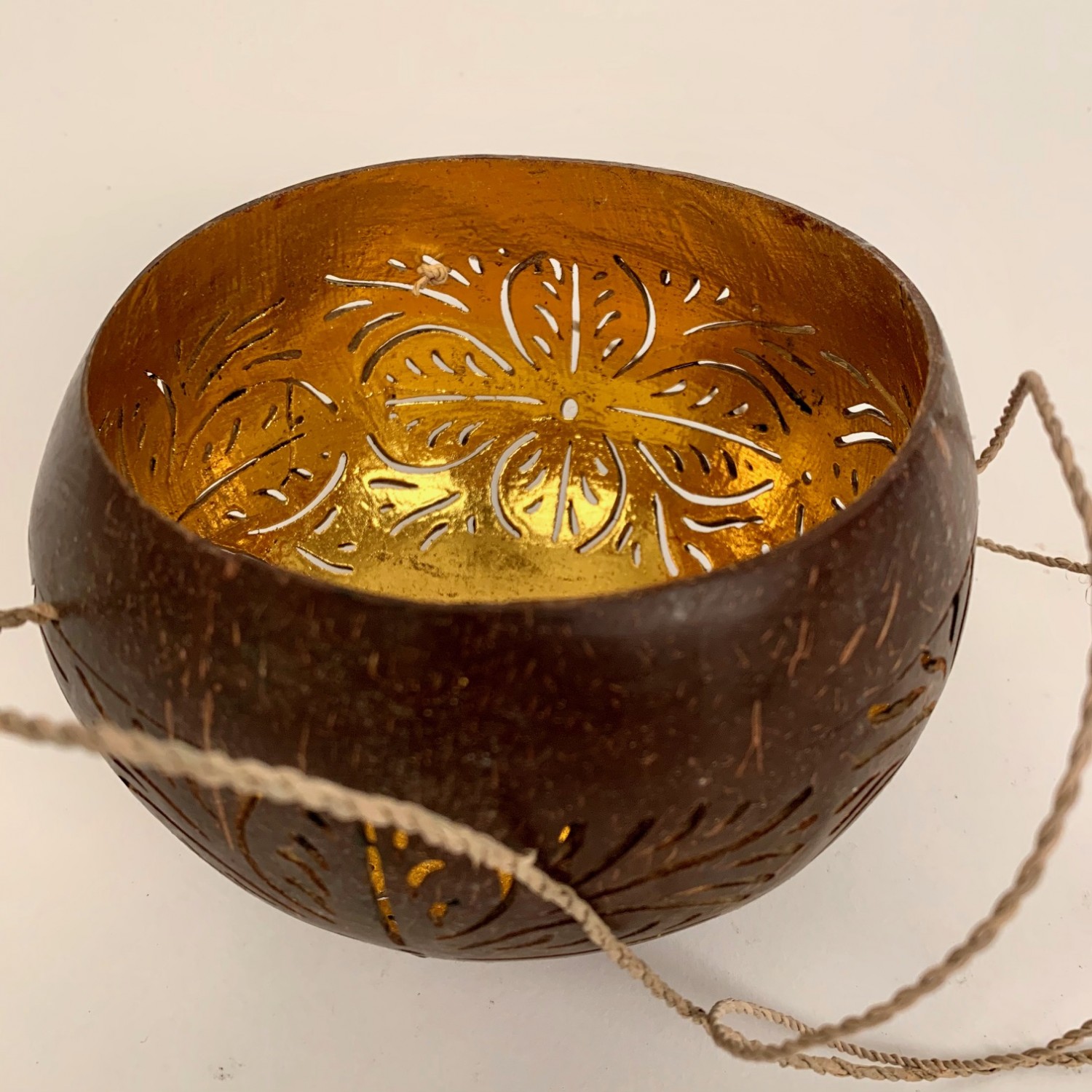 Kokosnoot waxinelichthouder goud-naturel hangend. Deze in patronen uitgesneden kokosnoot is leuk, decoratief, sfeervol én uniek, deze waxinelichthouder heeft het allemaal.