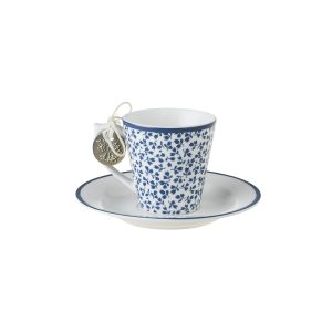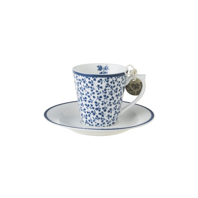 Espresso kop en schotel, afgewerkt met een royalblauwe rand, komt uit de Laura Ashley Blueprint Collectables serie dat geïnspireerd is op de oudste ontwerpen van Laura Ashley zelf en de prachtige dessins zijn weergegeven op porselein van verfijnd New Bone China. Erg leuk om naar eigen smaak te combineren met ieder ander item uit deze romantische serie.
