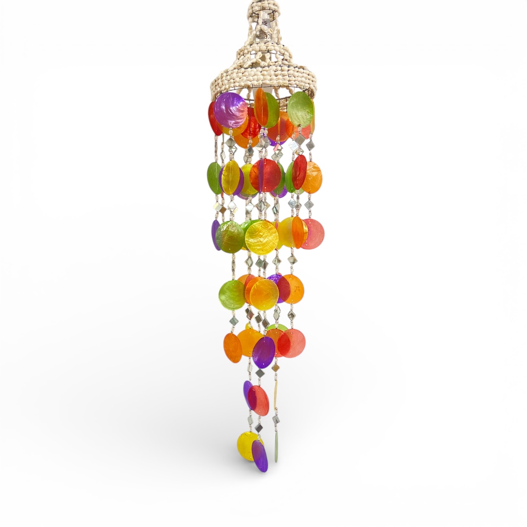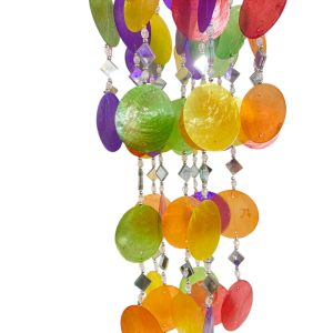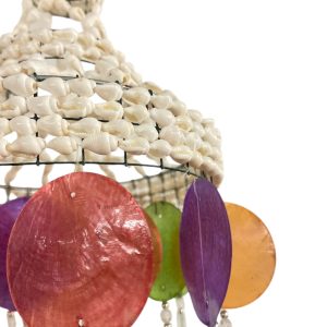 De lampenkap multi Schelp, Capiz & Spiegeltjes heeft een lengte van ca. 82 cm en een diameter van ca. 15 cm. Het ontwerp bestaat uit capizschelpen in meerdere kleuren, gecombineerd met kleine spiegeltjes die het licht op een speelse manier weerkaatsen.