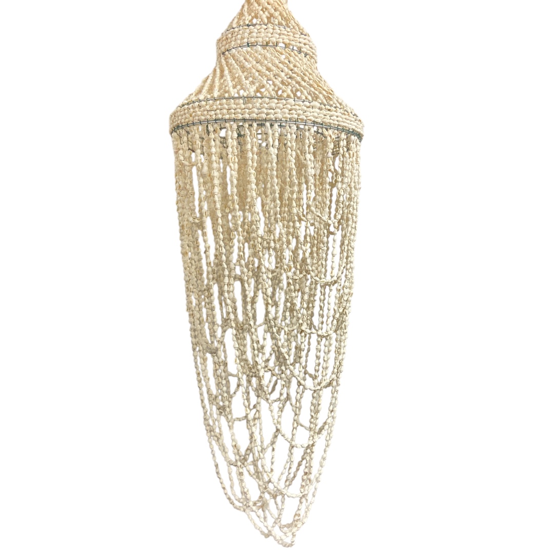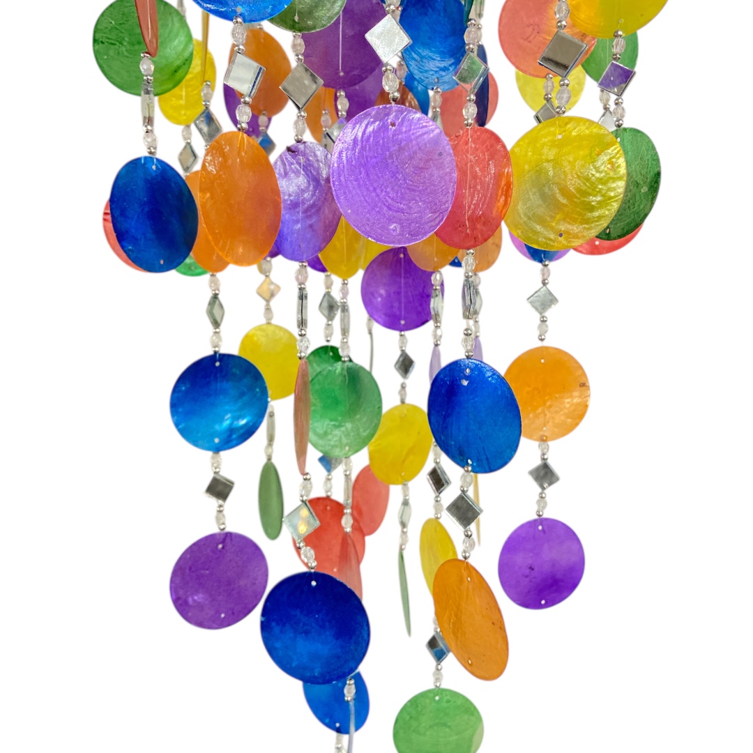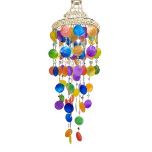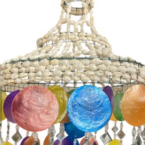 Deze lampenkap multi Schelp, Capiz & Spiegeltjes heeft een lengte van ca. 88 cm en een diameter van ca. 22 cm. De lampenkap is opgebouwd uit capizschelpen in verschillende kleuren, gecombineerd met kleine spiegeltjes die samen een speels en decoratief geheel vormen.