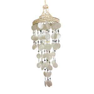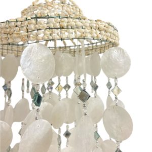 Deze lampenkap wit Schelp, Capiz & Spiegeltjes heeft een lengte van ca. 88 cm en een diameter van ca. 22 cm. De lampenkap is opgebouwd uit witte capizschelpen, gecombineerd met kleine spiegeltjes die samen zorgen voor een rustig en decoratief geheel.