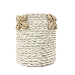 Dit mandje van waterhyacint is met de hand gevlochten en afgewerkt met witte schelpjes, wat zorgt voor een frisse en natuurlijke uitstraling.