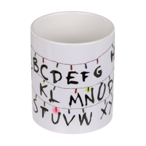 Voor de echte Stranger Things fans deze gave mok, met daarop de het alfabet en kerstverlichting scene erop afgebeeld. In de serie was dit de manier om te kunnen communiceren met Will toen hij in de ” upside down” wereld gevangen zat. Het alfabet werd op de muur geschilderen en de lampjes werden er boven gehangen door de moeder van Will ( Joyce) .