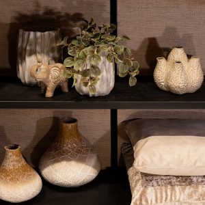 Het beeld is gemaakt van terracotta en heeft een zachte, aardse kleur die perfect past binnen natuurlijke en warme interieurstijlen. De subtiele patronen en vormen geven het beeld extra karakter en zorgen voor een stijlvolle uitstraling.