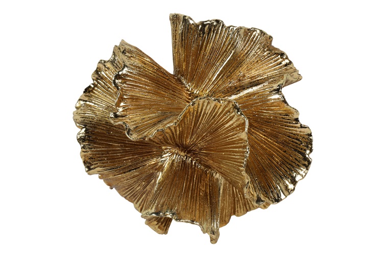 Dit goudkleurige ornament met ruffles-structuur is een echte blikvanger in ieder interieur. De organische, geplooide vorm geeft het object een luxe en speelse uitstraling, terwijl de warme goudtint zorgt voor een chique accent. Perfect om te plaatsen op een dressoir, sidetable of open kast, zowel als los decoratiestuk of gecombineerd met andere accessoires.