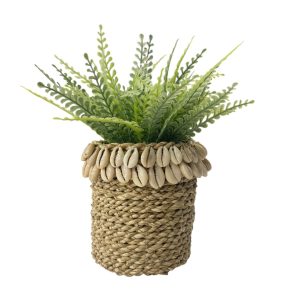 Dit plantenmandje is met de hand gevlochten en afgewerkt met een rand van natuurlijke schelpen. De combinatie van het gevlochten materiaal en de schelpen zorgt voor een rustige, natuurlijke uitstraling die mooi past binnen een bohemian, coastal of naturel interieur.