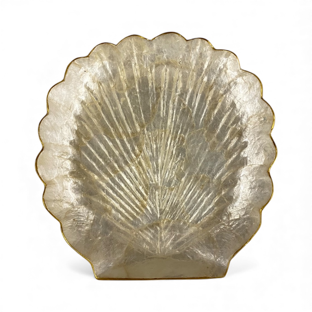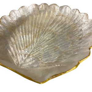 Deze schelpvormige schaal met gouden rand in wit, maat L, is een prachtig decoratiestuk dat een rustige maar luxe uitstraling toevoegt aan je interieur. De elegante vorm en glanzende afwerking maken het ideaal voor gebruik als sieradenschaal, tafeldecoratie of als stijlvol accent in een kast of op een dressoir.