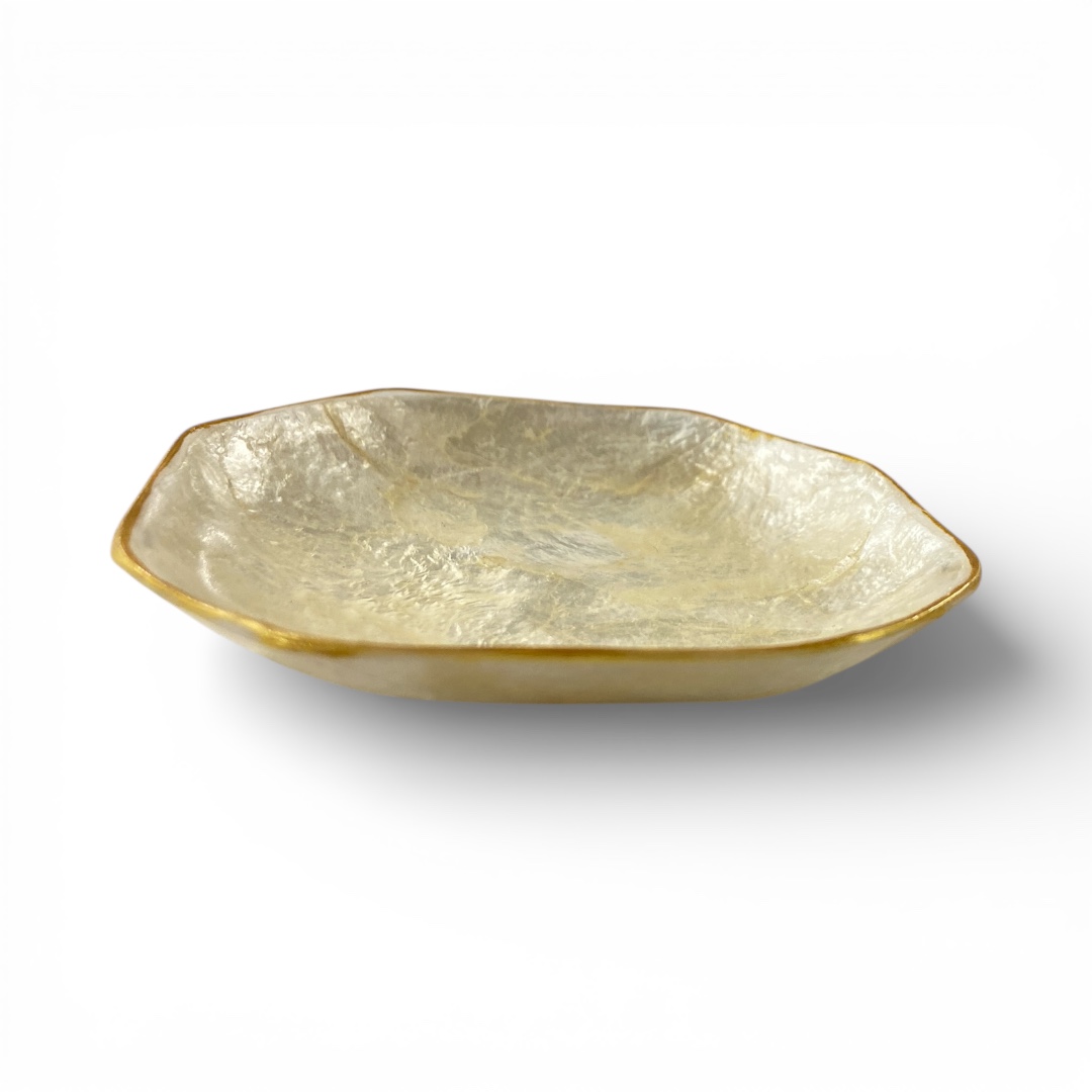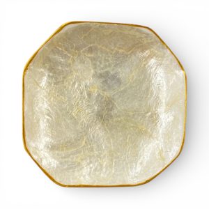 Dit achthoekige schaaltje van capiz heeft een afmeting van ca. 10 x 10 x 2 cm. De strakke, geometrische vorm wordt gecombineerd met de natuurlijke glans van capiz, wat zorgt voor een mooi contrast tussen lijnenspel en een zachte, parelmoerachtige uitstraling.