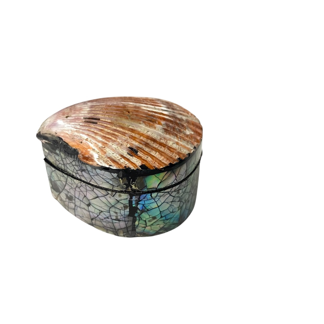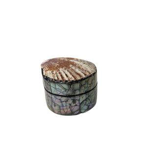 Dit kleine schelpendoosje is een schitterend natuurproduct dat direct een vleugje kustsfeer in huis brengt.