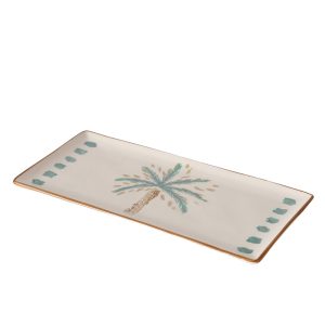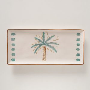 De Serving Platter Palmizio is een handgeschilderd en kleurrijk dienblad van hoogwaardig aardewerk. Met een rechthoekig formaat van ca. L35 × B16 cm biedt hij voldoende ruimte om hapjes, snacks of gebak stijlvol te presenteren. De geglazuurde en geprinte afwerking in turquoise en wit geeft een glanzend, decoratief effect, terwijl het handgemaakte ontwerp elk exemplaar uniek maakt. Perfect als blikvanger op tafel of voor feestelijke gelegenheden.