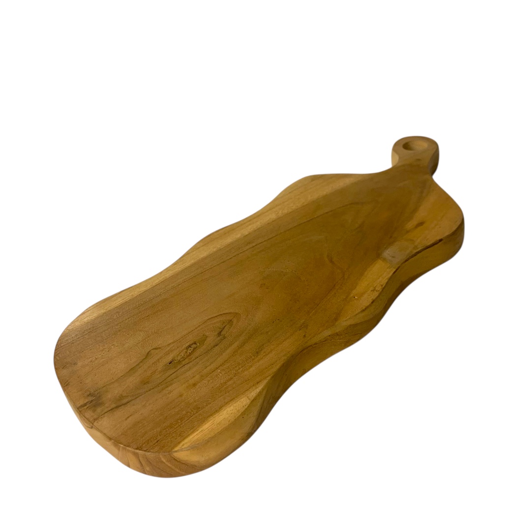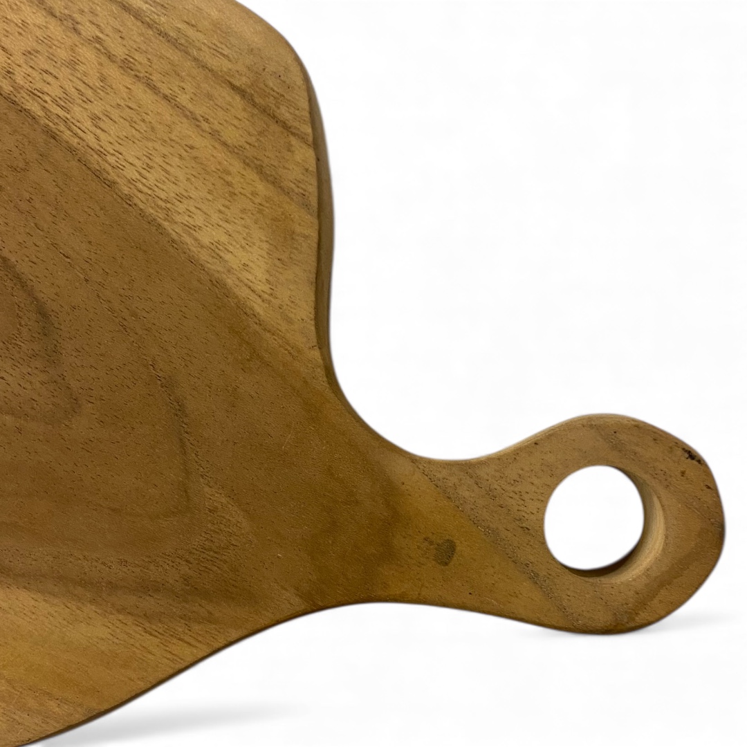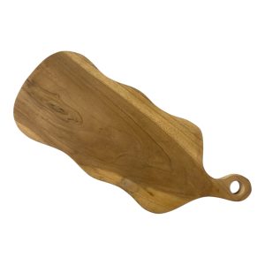 De natuurlijke houtkleur en speelse organische vorm geven de plank een warme, ambachtelijke uitstraling die past binnen zowel moderne als landelijke interieurs. De handgreep zorgt niet alleen voor een mooie afwerking, maar maakt het ook extra handig om de plank op te tillen, te presenteren of op te hangen.