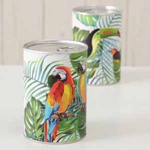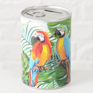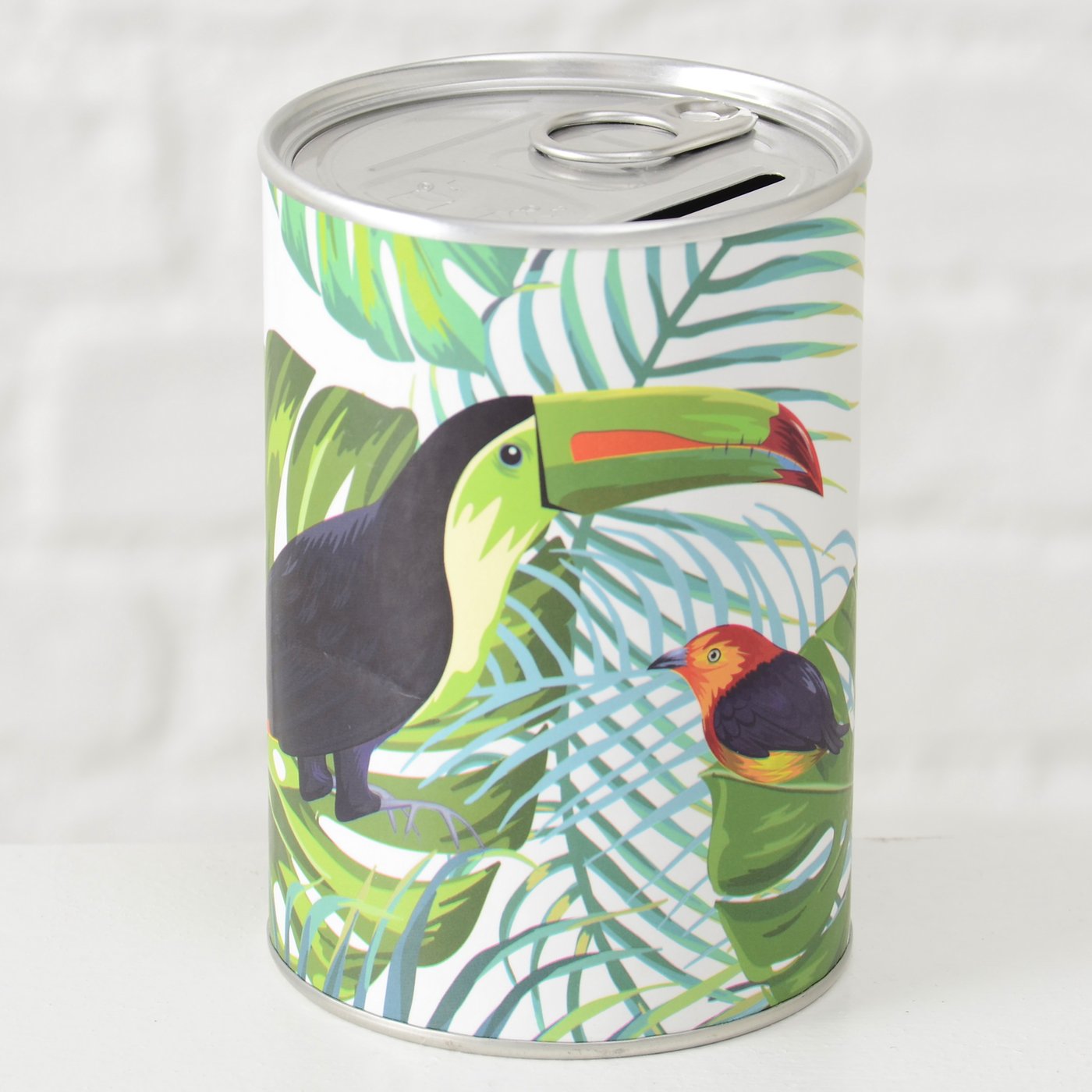 Voeg een vrolijke, tropische touch toe aan je interieur met deze kleurrijke spaarpot Toucan. De metalen spaarpot is bedrukt met exotische vogels en junglebladeren, waardoor hij perfect past in een kinderkamer, speelhoek of als decoratieve eyecatcher in huis. Dankzij het compacte formaat is hij ideaal om kleingeld of zakgeld in te bewaren.