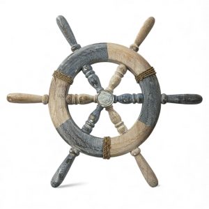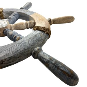 Decoratief stuurwiel in naturel, wit- en blauwe tinten, gemaakt van hout met touwdetails. Aan de achterkant zit een haakje, zodat je het stuurwiel eenvoudig kunt ophangen aan de wand. Perfect voor een coastal, nautisch of beach interieur, bijvoorbeeld in de hal, woonkamer, badkamer, veranda of in een strandhoekje.