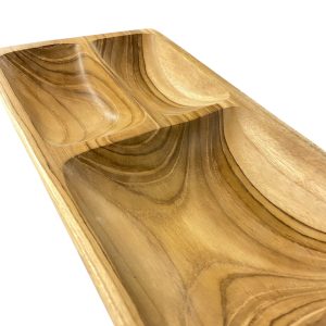 Serveer je hapjes, nootjes of dips in stijl met deze sushi- of snack schaal van teakhout met drie vakken.