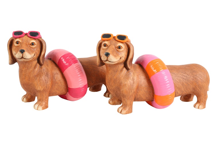 Teckel Larry met reddingsring is een vrolijk en speels decoratiebeeld dat direct een zomerse sfeer in huis brengt. De teckel draagt een kleurrijke reddingsring en een zonnebril, wat zorgt voor een humoristische en charmante uitstraling. De warme bruine tint in combinatie met de felle accenten maakt dit beeld een echte blikvanger.