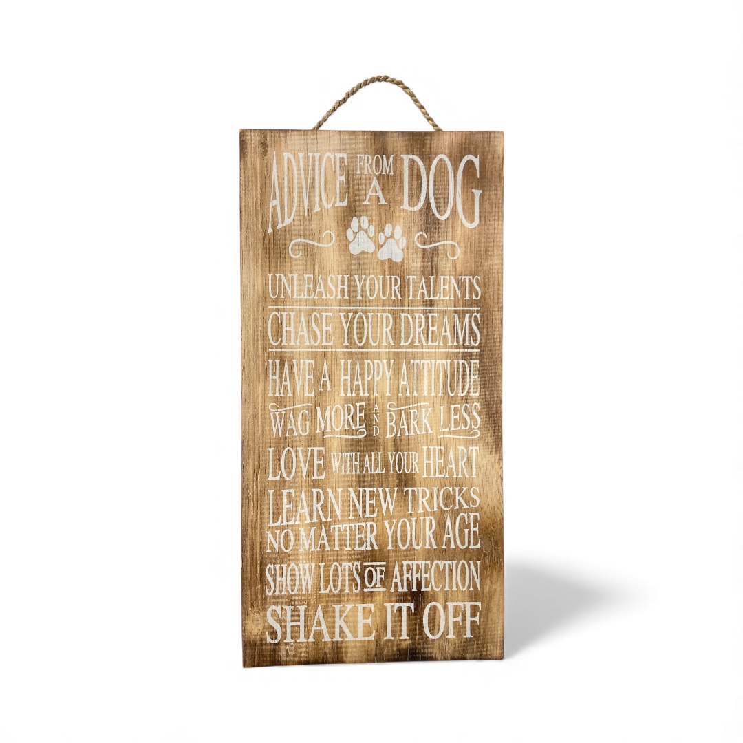 Dit houten tekstbord met de tekst “Advice From a Dog” is een vrolijke en inspirerende toevoeging aan je interieur. De warme naturel tinten en speelse typografie zorgen voor een gezellige uitstraling die perfect past in de woonkamer, hal, keuken of als cadeau voor een hondenliefhebber. Het bord is eenvoudig op te hangen dankzij het touw aan de bovenkant.