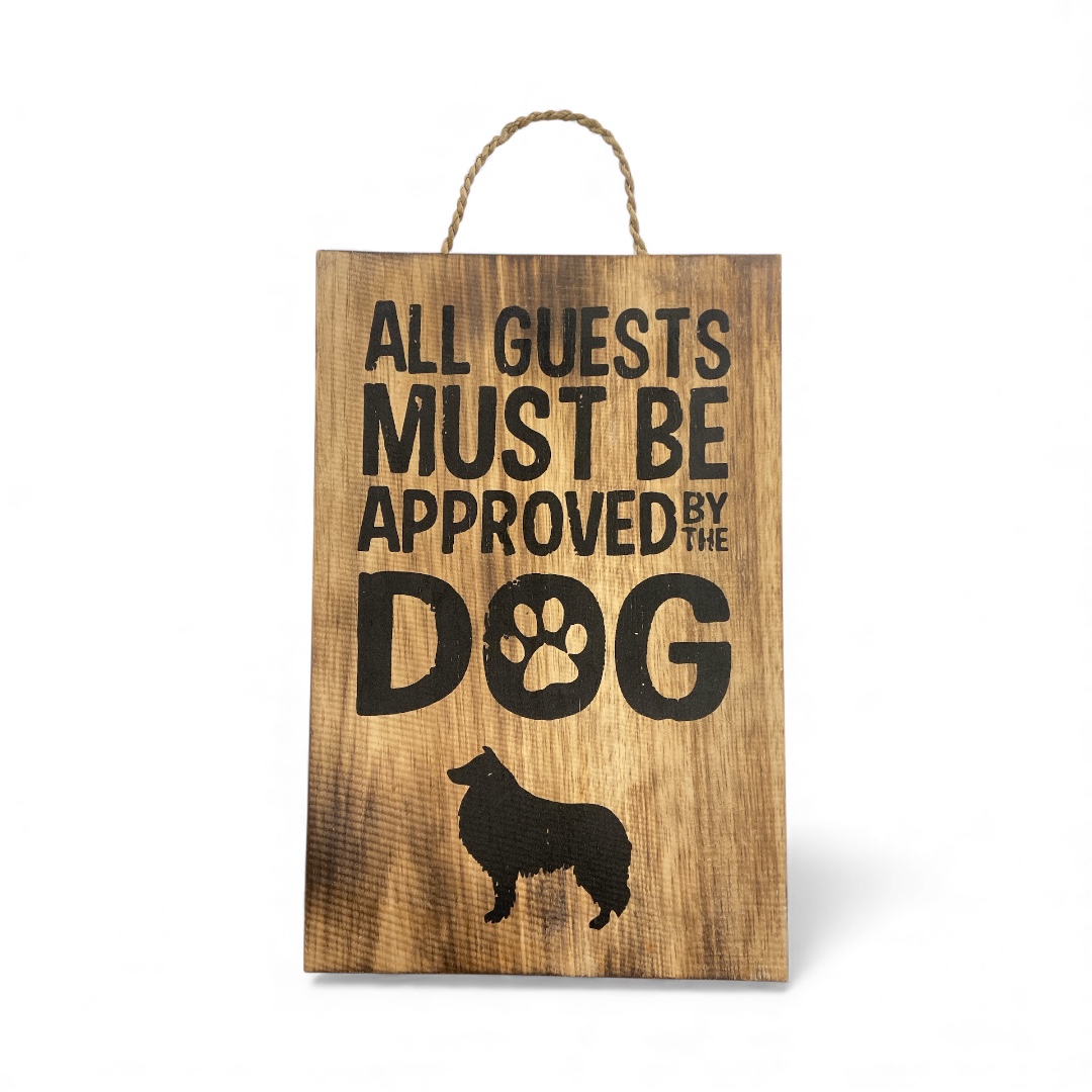 Tekstbord “All Guests Must Be Approved by the Dog” van ca. 30×20?cm in naturel hout. Dit handgemaakte bord geeft een speels en gezellig accent aan je interieur en is perfect voor in de hal, woonkamer of bij de deur. De herkenbare en humoristische tekst maakt het bord ook een leuk cadeau voor hondenliefhebbers.