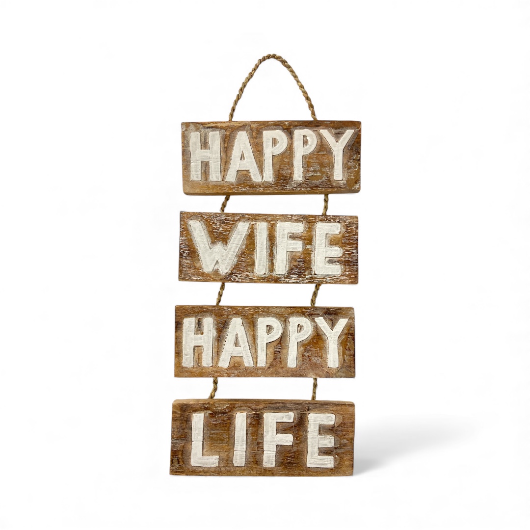 Dit houten tekstbord met de tekst “Happy Wife Happy Life” zorgt voor een gezellige en speelse toevoeging aan je interieur. De naturel houten plankjes met witte letters geven een warme en huiselijke uitstraling. Leuk voor in de woonkamer, keuken, hal of als humoristisch cadeau.