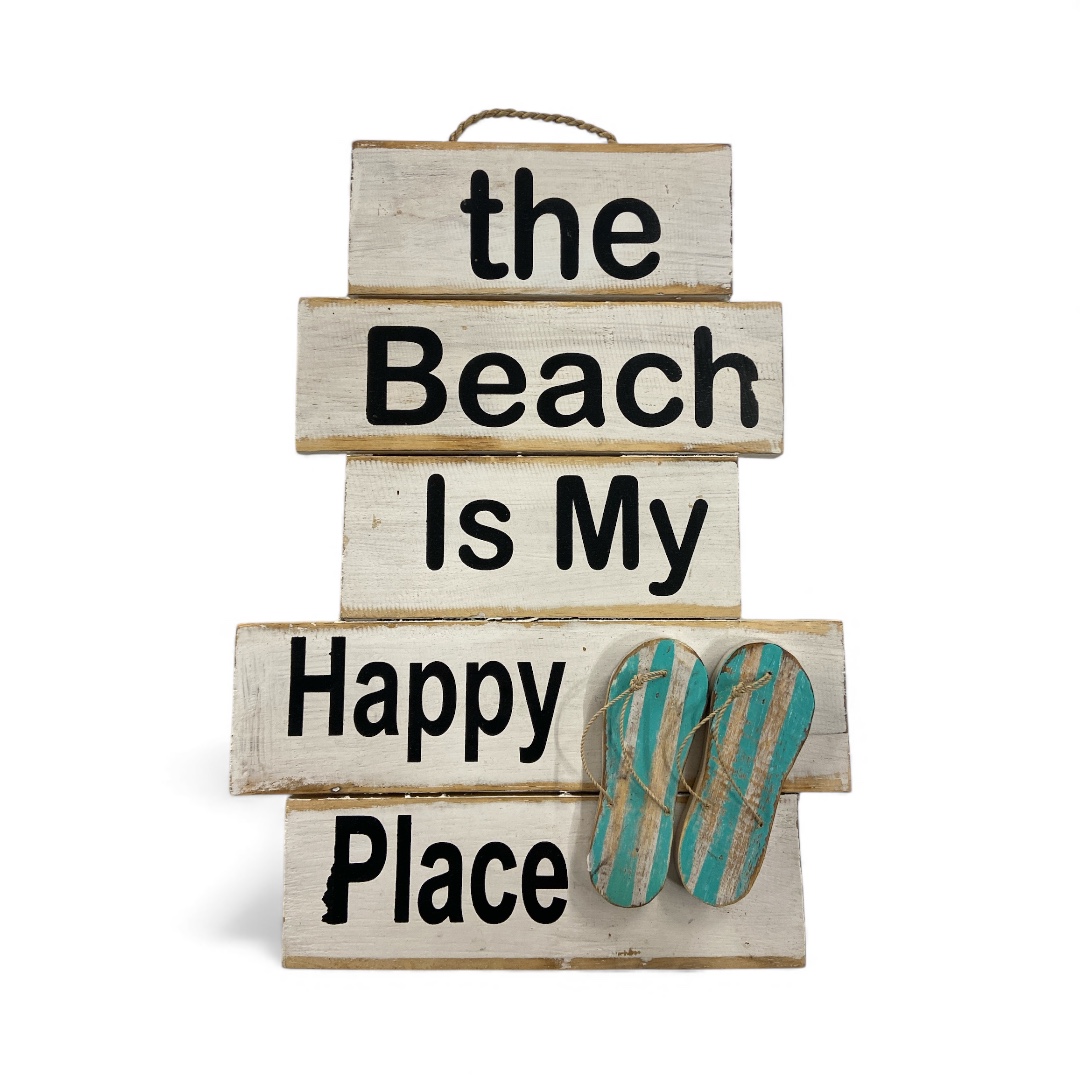 Houten tekstbord met de tekst “The Beach Is My Happy …”, uitgevoerd in een rustige beachstijl. De tekst en uitstraling brengen direct een zomers en ontspannen gevoel in huis. Dit bord past perfect binnen een beach, coastal of naturel interieur en is mooi voor aan de wand in de woonkamer, hal, slaapkamer, veranda of strandhuisje.