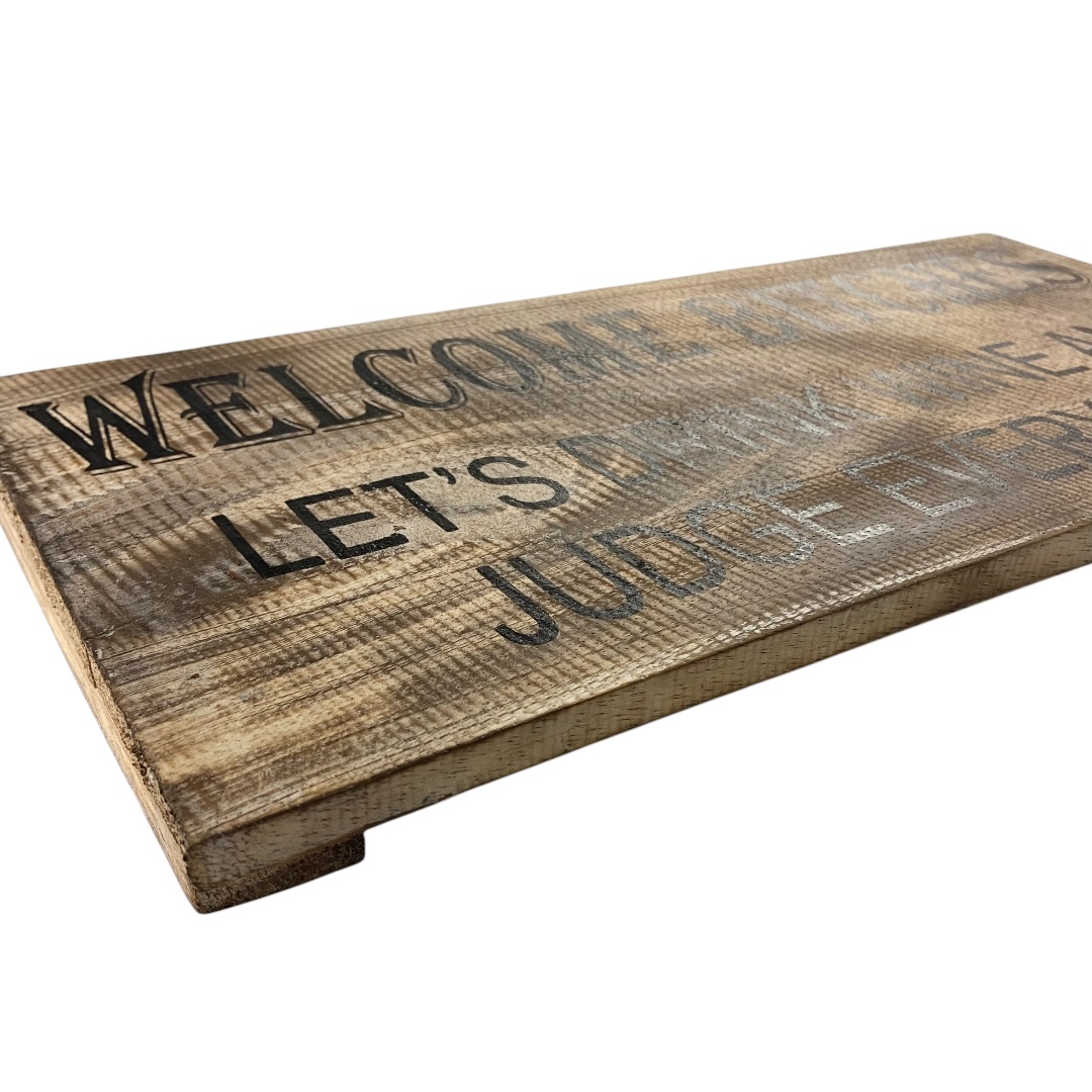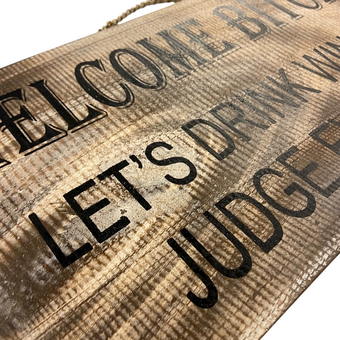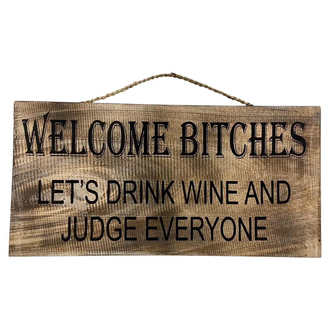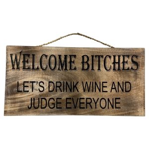 Breng humor en gezelligheid in huis met dit handgemaakte houten tekstbord “Welcome Bitches Let’s Drink Wine and Judge Everyone”. Met zijn warme houtkleur en speelse zwarte opdruk is dit bord dé blikvanger voor aan de muur van je keuken, bar of woonkamer. Dankzij het ophangtouw is het bord eenvoudig te bevestigen aan muur of deur.