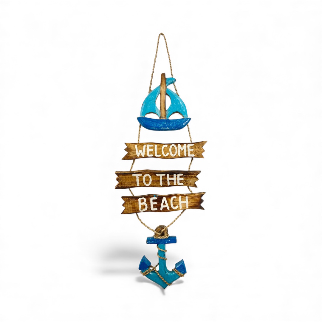 Tekstbord “Welcome To The Beach” met anker in blauw/turquoise van ca. 58×20?cm. Dit handgemaakte bord brengt een vrolijke, nautische sfeer in je interieur en is ideaal voor in de woonkamer, hal, veranda of strandhuis. Het natuurlijke hout en het speelse zee-thema maken het bord geschikt voor een beach, coastal of landelijke woonstijl.