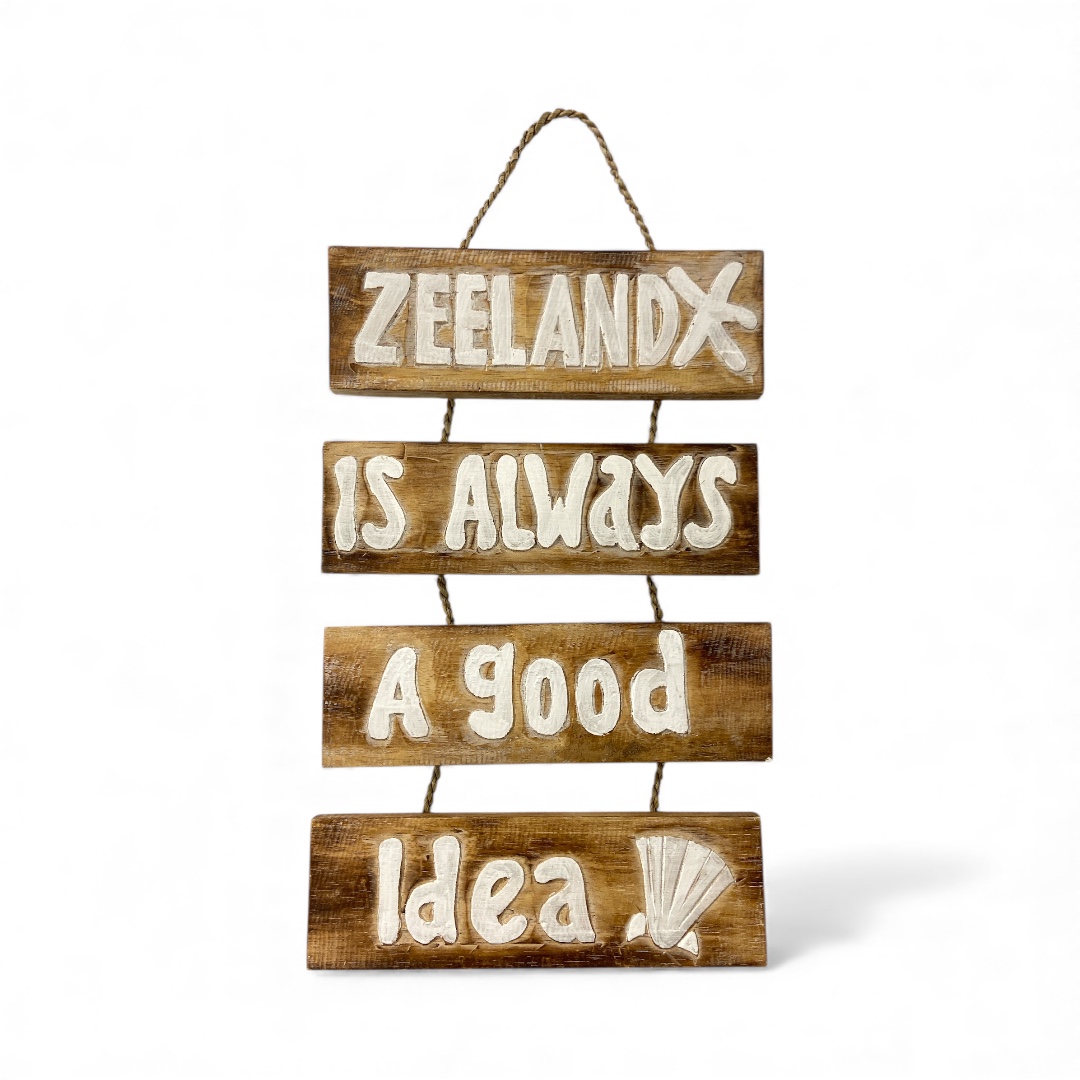 Dit houten tekstbord met de tekst “Zeeland Is Always A Good Idea” geeft direct een warme, beachy sfeer aan je interieur. Het bord is gemaakt van natuurlijk hout en heeft een speelse, handgemaakte uitstraling. Leuk voor aan de wand in de gang, woonkamer, veranda of vakantiehuisje.