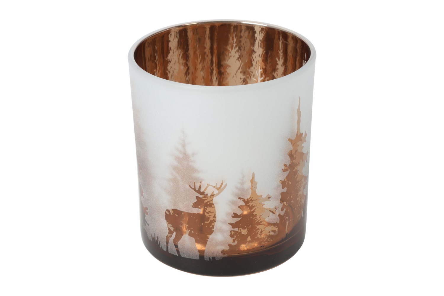 De theelichthouder Caja S brengt de magie van een besneeuwd bos direct in jouw leefruimte. Het matte zilverkleurige glas toont een prachtig tafereel met bomen en een edelhert in elegant koperkleur. Wanneer je een kaarsje aansteekt, weerspiegelt de binnenzijde het licht en creëert een warme en uitnodigende sfeer. Dit maakt de theelichthouder perfect voor een stijlvolle wintertafel of een sfeervol hoekje in je huis, winkel of horecagelegenheid.