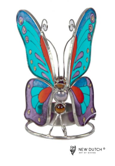 Tiffany tealightholder butterfly van New Dutch. Een prachtige decoratieve vlinder met theelichthouder. Met een brandend waxinelichtje erachter geeft de vlinder haar prachtige kleuren prijs. De vlinder is van metaal/glas, en heeft een hoogte van ±12cm.