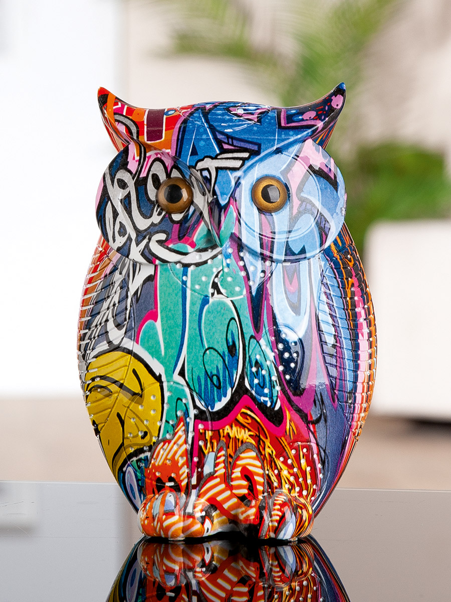 street art uil beeld, graffiti uil decoratie, uil beeld modern, urban art beeld uil, kleurrijke uil sculptuur, uil woonaccessoire, street art decoratie, graffiti dierenbeeld, moderne kunst uil, design beeld uil